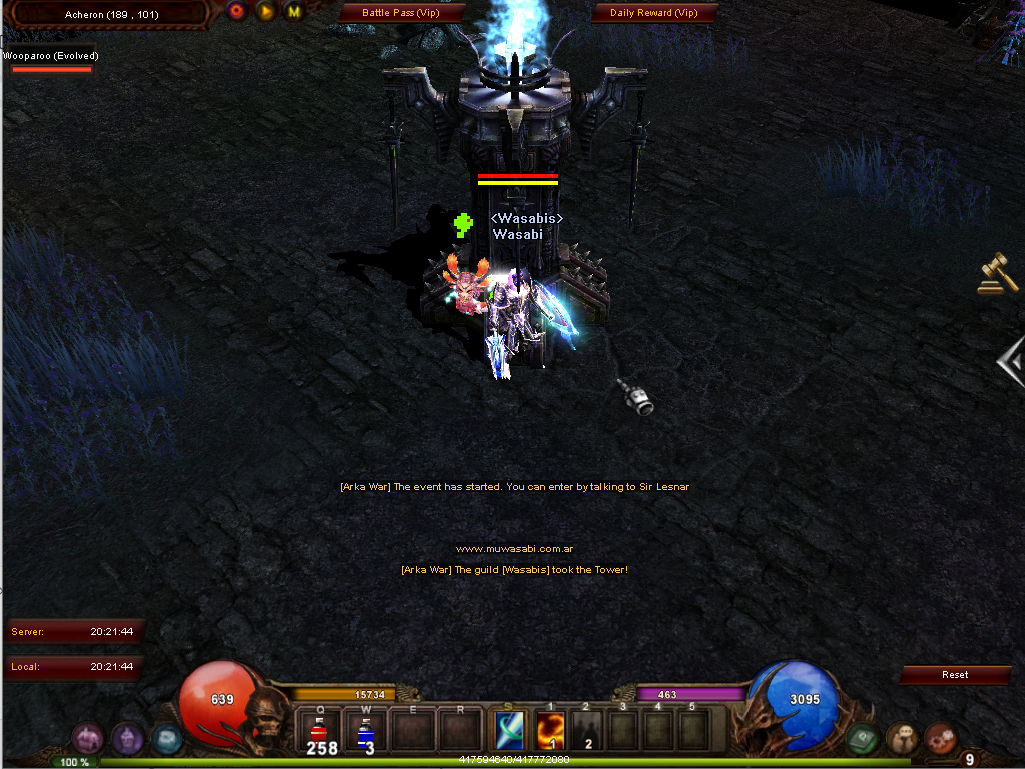 Arka War es un evento de Guilds en Wasabi Mu, cualquier Guild puede participar y el objetivo es mantener control de el Area de la Torre de el evento durante 15 minutos.&#x20;